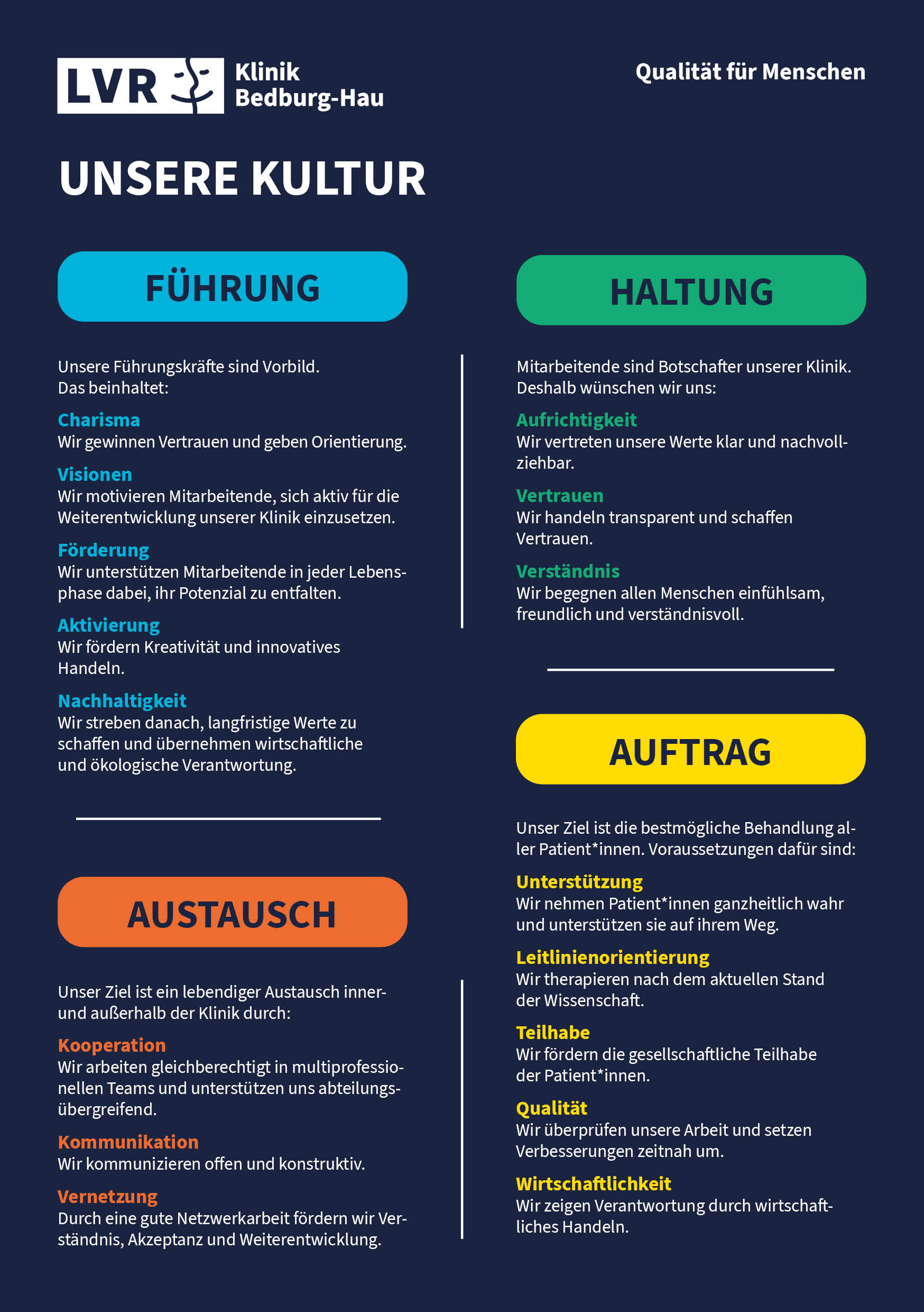 Seit Sommer 2025 gibt es eine Klinik-Kultur für die LVR-Klinik Bedburg-Hau, in der wir unseer Grundsätze zu Auftrag, Haltung, Führung und Austausch verbindlich festgelegt haben.